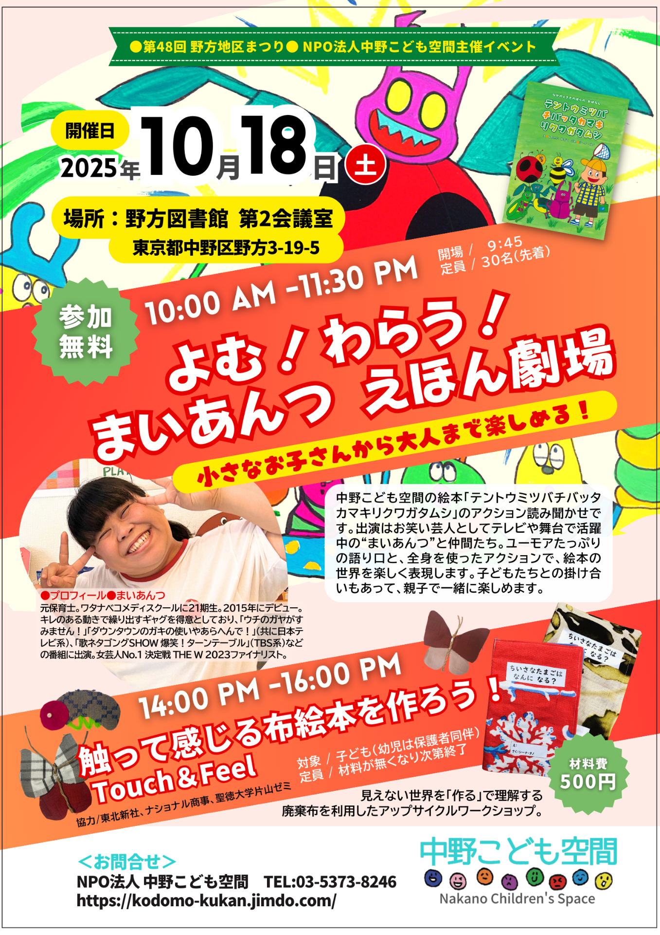 野方地域まつり、野方図書館では、午前中はお笑い芸人まいあんつのユニークなアクション読み聞かせを楽しく笑いながら体験。午後は、昨年と同じマイティブックの見えない世界を理解するワークショップ「触って感じるに布絵本をつくろう!」を開催します!