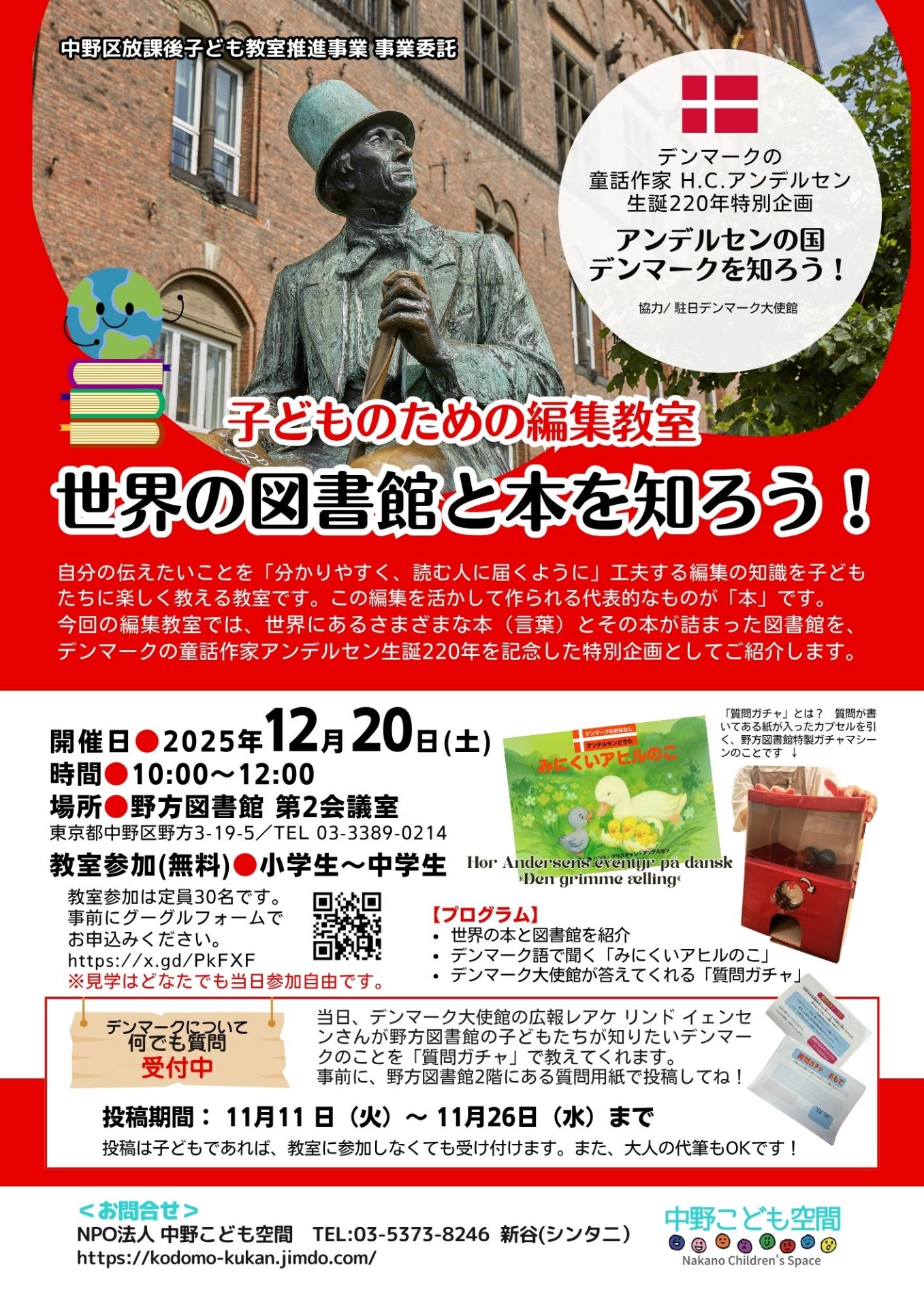 2025年12⽉20日(土曜)に、子どものための編集教室「世界の図書館と本を知ろう!」で、H.C.アンデルセン生誕220年特別企画「アンデルセンの国 デンマークを知ろう!」を開催します。