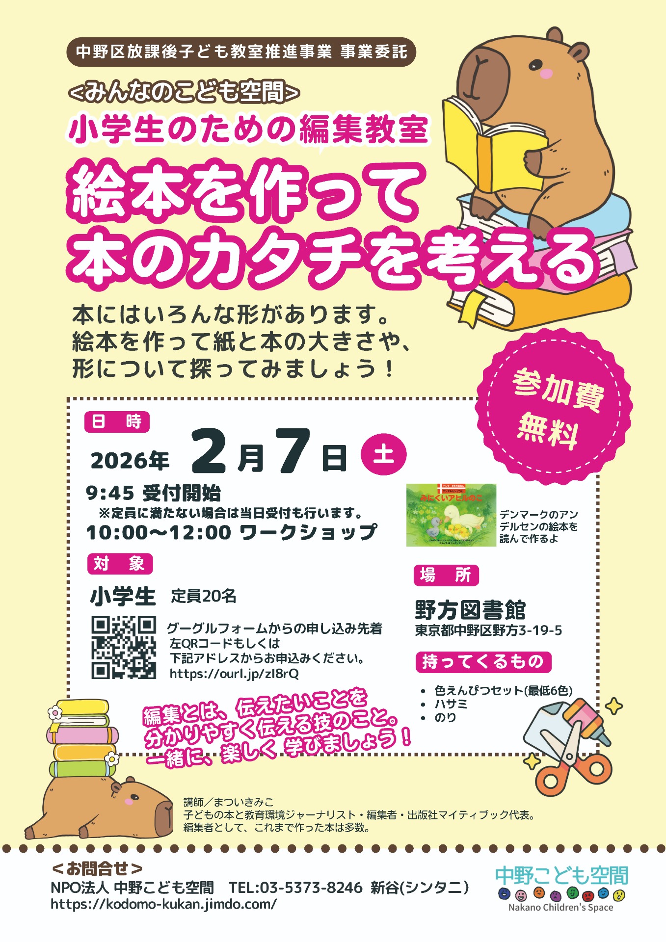 中野子ども空間が主催する「小学生のための編集教室」です。今回は、大きな紙の折り方で異なるサイズの本ができることや、ページの関係を実際に絵本を作りながら、本のカタチを学びます。